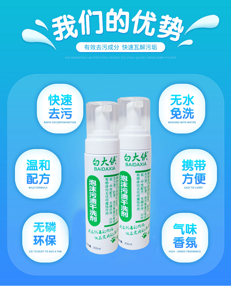 使用方法:將本品直接噴于抹布或頑垢上對(duì)其反復(fù)擦揉、待污漬去除后用毛巾抹干凈即可、如可水洗的用40至60C度之間的溫水配合本品清洗效果更佳。